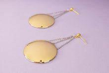 Domed gold or silver plated copper disks, 32mm in diameter. Connected by 5cm silver-plated stainless steel chains to a gold or silver plated stainless steel ear stud.